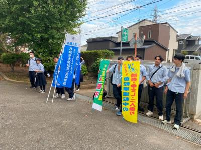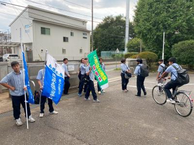9月19日(金)の放課後、交通委員の生徒が、交通安全呼びかけの活動を行いました。秋の全国交通安全運動が行われる中、本校生の交通マナー向上を目的として、正門を通る生徒に明るく声をかけていました。