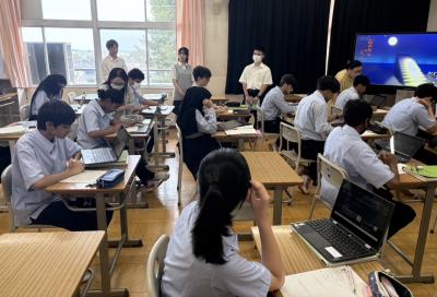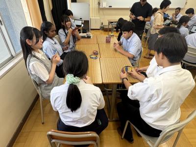 「総合的な探究の時間」には、コミュニケーションについて探究活動をしている2年生のグループとゲームで交流し、放課後は本校の地形調査グループと「多文化共生」についてディスカッションを行いました。